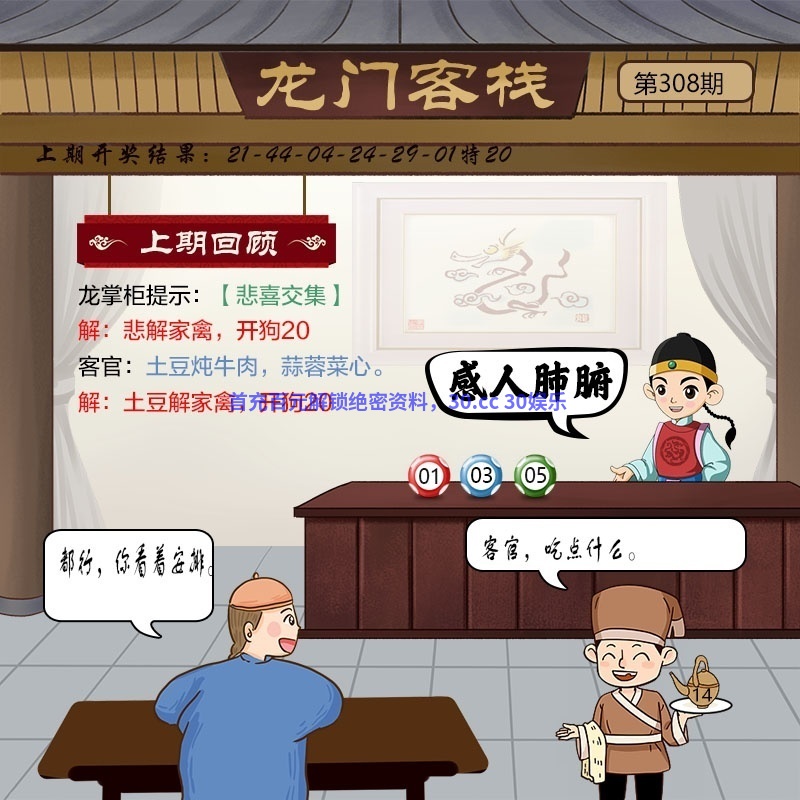 307期:【本草纲目】破解龙门客栈 掌柜:悲喜交集 解释:指悲伤与喜悦的情绪交织共存 小二:客官,请上二楼包间 解释:无 客官:土豆炖牛肉,蒜蓉菜心 解释:土豆解土肖的生肖牛、龙、羊、狗,菜心解菜肖的生肖猪、鼠、鸡、猴 特肖:虎蛇猴龙羊牛狗鼠马 |